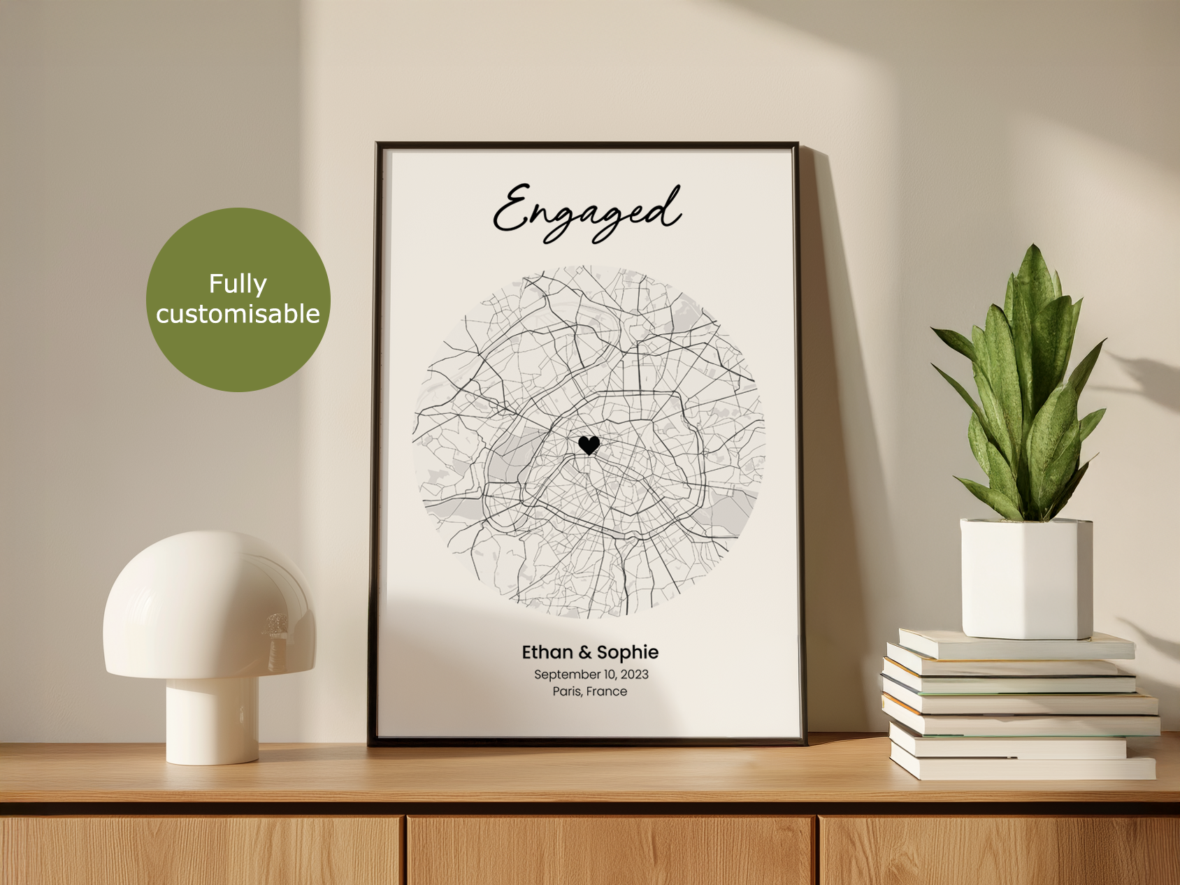 Celebrate your engagement with a beautiful and modern custom engagement map poster, designed to capture the exact spot where your love story took the next step. From the moment you said “yes” to forever, this elegant artwork transforms that location into a timeless keepsake.