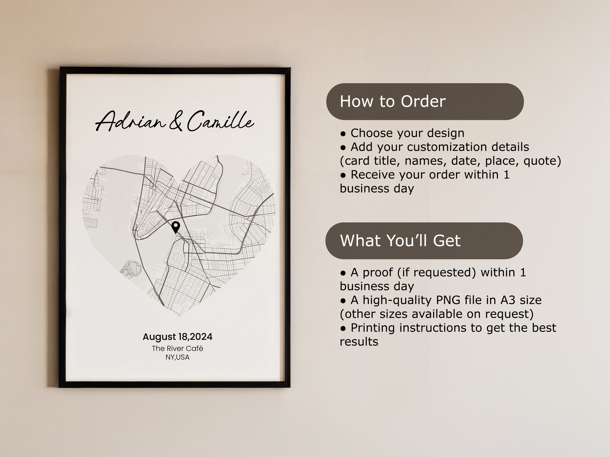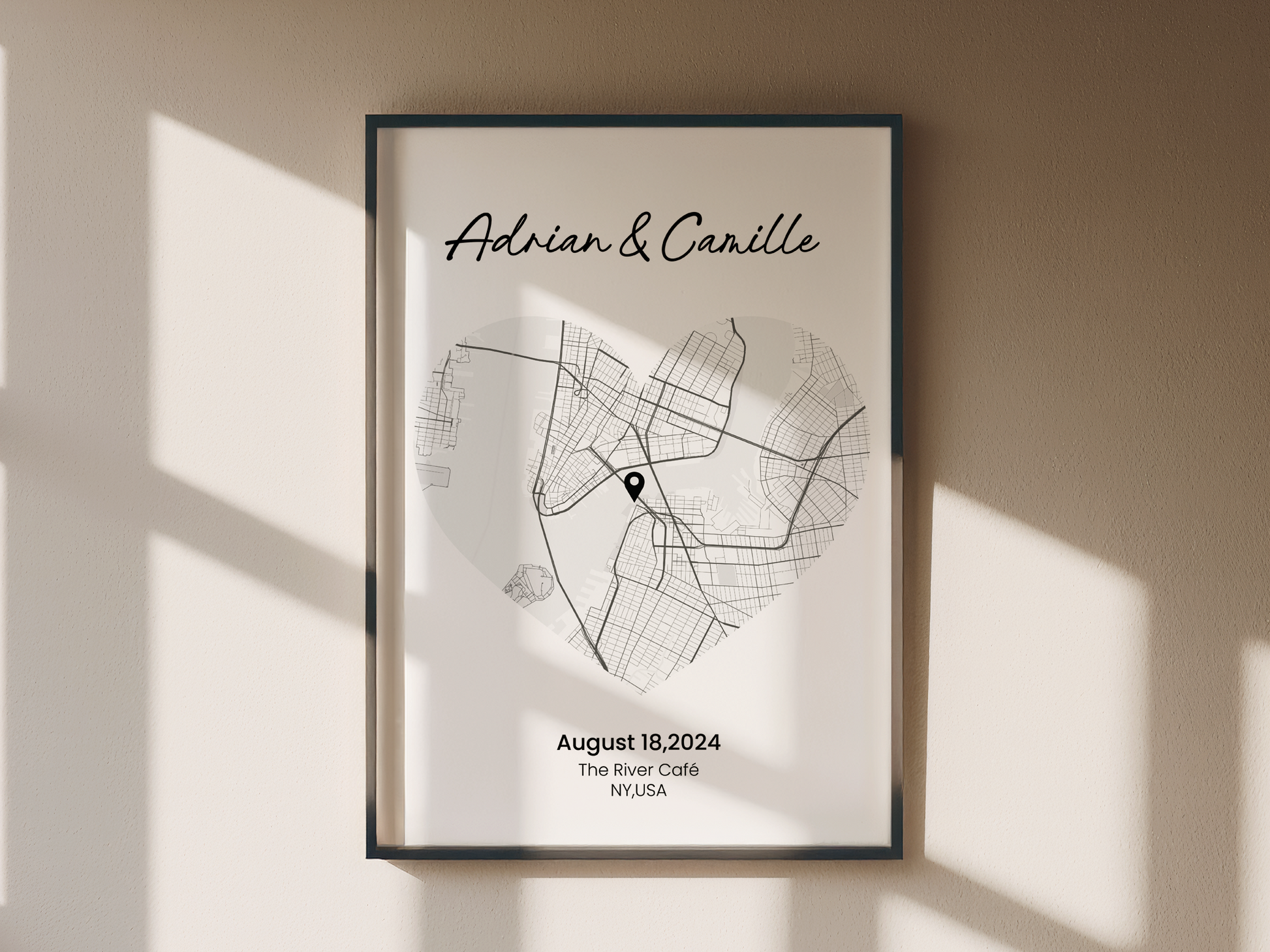 Celebrate your special moment with a beautiful and modern custom map poster, designed to capture the exact spot where your love story took the next step. From the moment you said “yes” to forever, this elegant artwork transforms that location into a timeless keepsake.